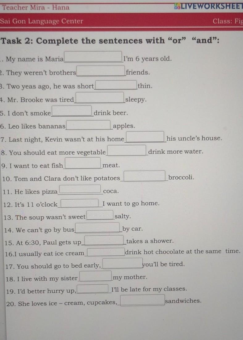 Sai Gon Language Center Task 2: Complete the sentences with "or" "and": 1. My name is Maria I'm 6 years old. 2. They weren't brothers friends. 3. Two yeas ago, he was short 4. Mr. Brooke was tired 5. I don't smoke 6. Leo likes bananas apples. 7. Last night, Kevin wasn't at his home 8. You should eat more vegetable 9. I want to eat fish 10. Tom and Clara don't like potatoes_ 11. He likes pizza 12. It's 11 o'clock 13. The soup wasn't sweet 14. We can't go by bus 15. At 6:30, Paul gets up_ 16.I usually eat ice cream 17. You should go to bed early, 18. I live with my sister 19. I'd better hurry up, 20. She loves ice cream, cupcakes, drink beer. meat. coca. thin. sleepy. drink more water. I want to go home. salty. his uncle's house. broccoli. Class: Fig by car. takes a shower. drink hot chocolate at the same time. you'll be tired. my mother. I'll be late for my classes. sandwiches.