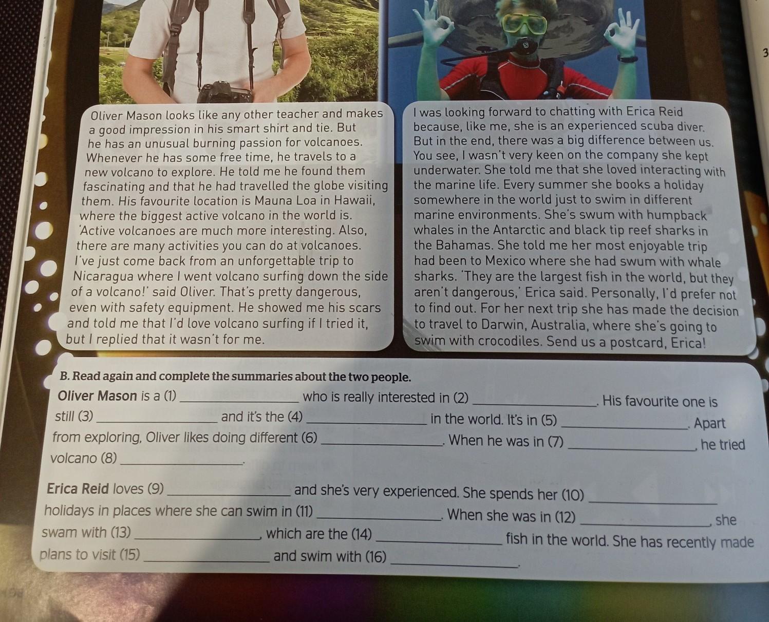 поможіть))))Oliver Mason looks like any other teacher and makes a good impression in his smart shirt and tie. But he has an unusual burning passion for volcanoes. Whenever he has some free time, he travels to a new volcano to explore. He told me he found them fascinating and that he had travelled the globe visiting them. His favourite location is Mauna Loa in Hawaii, where the biggest active volcano in the world is. Active volcanoes are much more interesting. Also, there are many activities you can do at volcanoes. I've just come back from an unforgettable trip to Nicaragua where I went volcano surfing down the side of a volcano!' said Oliver. That's pretty dangerous, even with safety equipment. He showed me his scars and told me that I'd love volcano surfing if I tried it, but I replied that it wasn't for me. B. Read again and complete the summaries about the two people. Oliver Mason is a (1) Not everyone enjoys a relaxing holiday around a pool getting a tan. Andy Thomas interviews two people who have a different view on what a holiday is. still (3) and it's the (4) from exploring, Oliver likes doing different (6) volcano (8) swam with (13) plans to visit (15) who is really interested in (2) Erica Reid loves (9) holidays in places where she can swim in (11) I was looking forward to chatting with Erica Reid because, like me, she is an experienced scuba diver. But in the end, there was a big difference between us. You see, I wasn't very keen on the company she kept underwater. She told me that she loved interacting with the marine life. Every summer she books a holiday somewhere in the world just to swim in different marine environments. She's swum with humpback whales in the Antarctic and black tip reef sharks in the Bahamas. She told me her most enjoyable trip had been to Mexico where she had swum with whale sharks. They are the largest fish in the world, but they aren't dangerous,' Erica said. Personally, I'd prefer not to find out. For her next trip she has made the decision to travel to Darwin, Australia, where she's going to swim with crocodiles. Send us a postcard, Erica! and she's very experienced. She spends her (10) When she was in (12) which are the (14) and swim with (16) in the world. It's in (5) When he was in (7) His favourite one is Apart Rewr he tried 1. 1 E 2. she fish in t