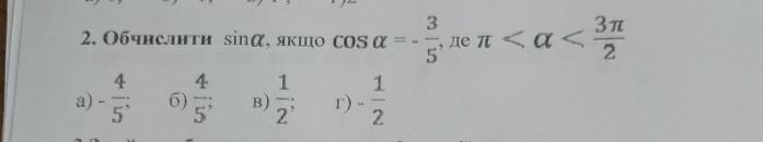 \displaystyle\bf\\\pi < \alpha < \frac{3\pi }{2}  \  \  \ \Rightarrow \  \  \ Sin\alpha < 0\\\\\\Sin\alpha =-\sqrt{1-Cos^{2} \alpha } =-\sqrt{1-\Big(-\frac{3}{5} \Big)^{2} } =\\\\\\=-\sqrt{1-\frac{9}{25} } =-\sqrt{\frac{16}{25} }=-\frac{4}{5} \\\\\\Otvet \ : \ a)