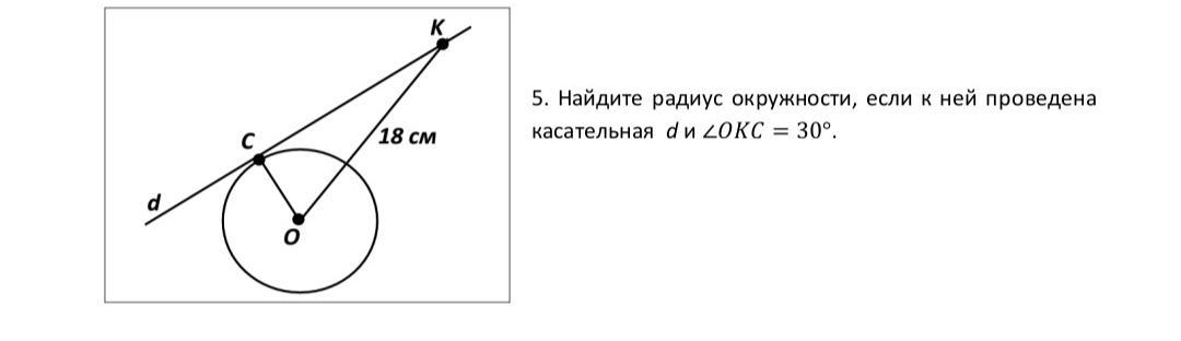 дано: окружность, d-касательная, угол OKC=30°. KO= 18см
