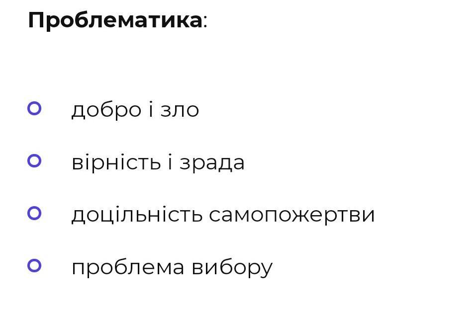 Проблематика- добро і зло, вірність і зрада, проблема вибору