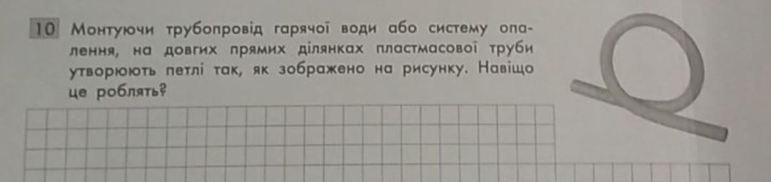 10 монтуючи трубопровід гарячої води або систему опа- лення, на довгих прямих ділянках пластмасової труби утворюють петлі так, як зображено на рисунку. Навіщо це роблять?СРОЧНО! даю 30 баллов
