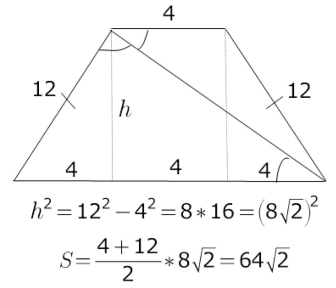 Основи різнобічної трапеції-4 см та 12 см,а діагональ ділить її тупий кут навпіл.Знайти площу трапеції.