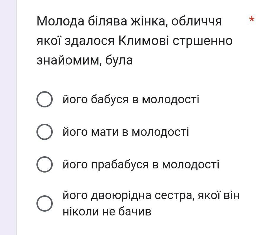 Молода білява жінка, обличчя якої здалося Климові стршенно знайомим, була о його бабуся в молодості його мати в молодості о його прабабуся в молодості O його двоюрідна сестра, якої він ніколи не бачив