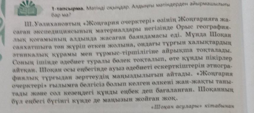 1-тапсырма. Мәтiндi оқыңдар. Алдыңғы мәтіндерден айырмашылығы бар ма? Ш.Уәлихановтың «Жоңғария очерктері» өзінің Жоңғарияға жа- саған экспедициясының материалдары негізінде Орыс география- лық қоғамының алдында жасаған баяндамасы еді. Мұнда Шоқан саяхатшыға тән жүріп өткен жолына, ондағы тұрғын халықтардың этникалық құрамы мен тұрмыс-тіршілігіне айрықша токталады. Соның ішінде әдебиет туралы белек тоқталып, өте құнды пікірлер айтқан. Шоқан осы еңбегінде ауыз әдебиеті ескерткіштерін этногра- фиялық тұрғыдан зерттеудің маңыздылығын айтады. «Жоңғария очерктері» ғылымға белгісіз болып келген өлкені жан-жақты таны- тады және сол кезеңдегі құнды еңбек деп бағаланған. Шоқанның бұл еңбегі бүгінгі күнде де манызын жойған жоқ. «Шоқан асулары» кітабынан