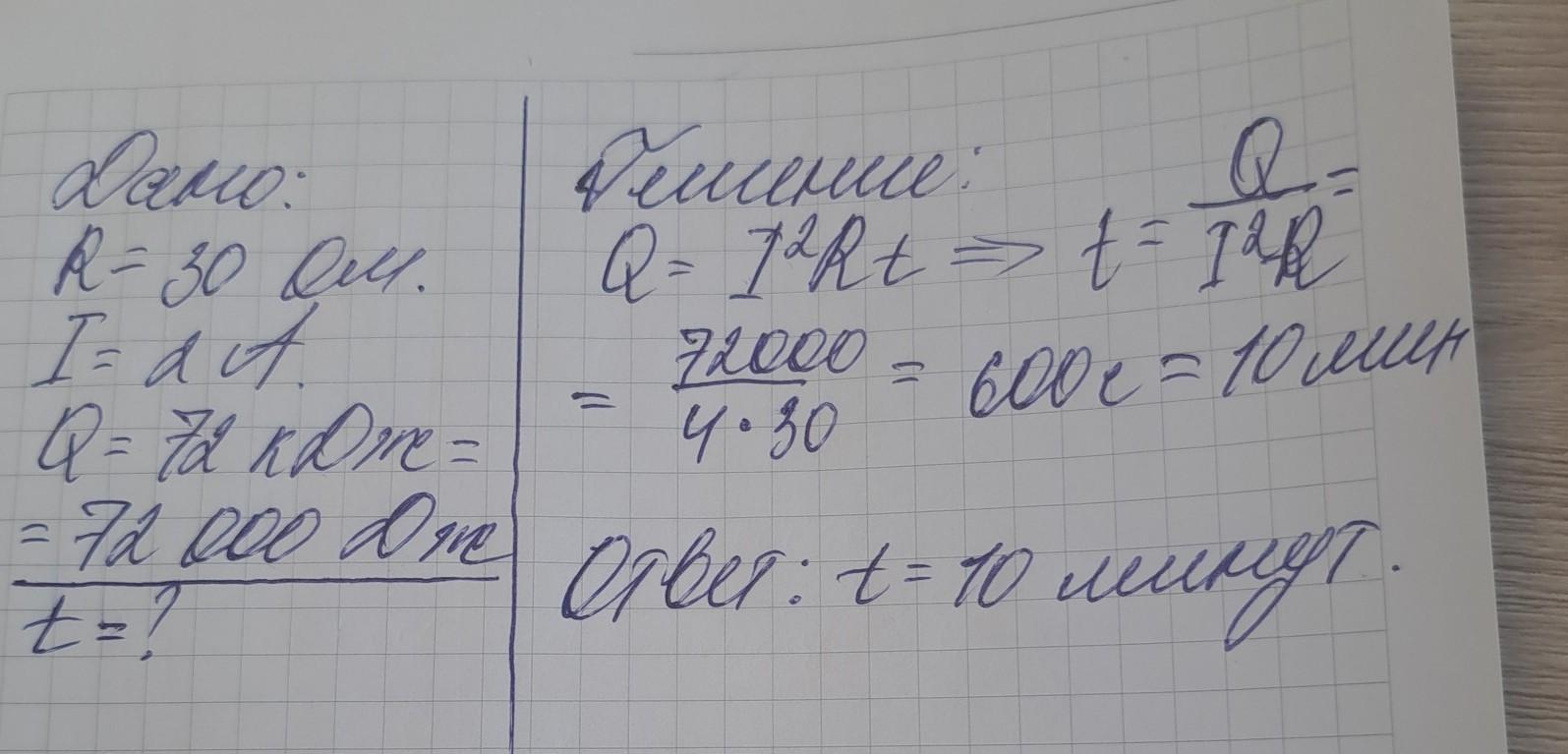 Сколько времени нагревалась проволочная спираль сопротивлением 30 Ом, если сила тока на ней была 2 A, a выделилось теплоты 72 кДж?
