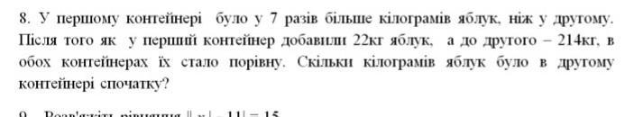 У першому контейнері було у 7 разів більше кілограмів яблук ніж у другому, після того як у перший контейнер добавили 22 кг яблук, а до другого- 214кг, в обох контейнерах їх стало порівну. Скільки кілограмів яблук було в другому контейнері спочатку?