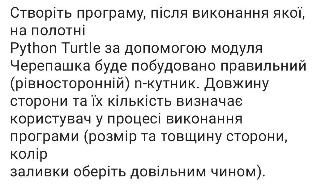 Ось приклад програми, яка будує правильний n-кутник на полотні Python Turtle: