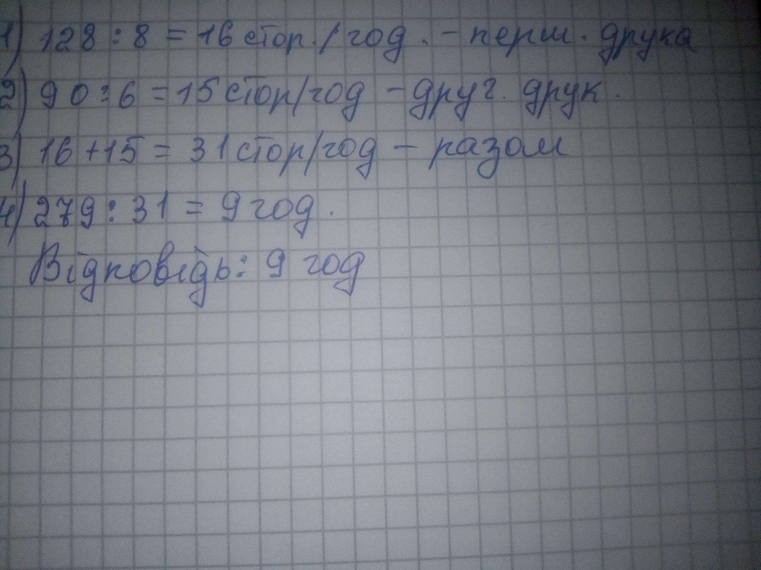 надрукував 90 сторінок. За скільки год, працюючи разом, друкарі надрукують 279