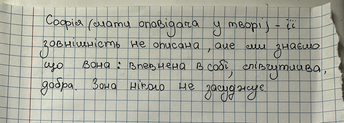 Софія (мати оповідача) – її зовнішність у творі не описано, проте дізнаємося про її вдачу: впевнена, тактовна, співчутлива. Вона не засуджує Марфу, яка кохає її чоловіка, а навпаки, з розумінням ставиться до її почуттів (навіть радить чоловікові, щоб той глянув на Марфу, яка дуже мучиться).