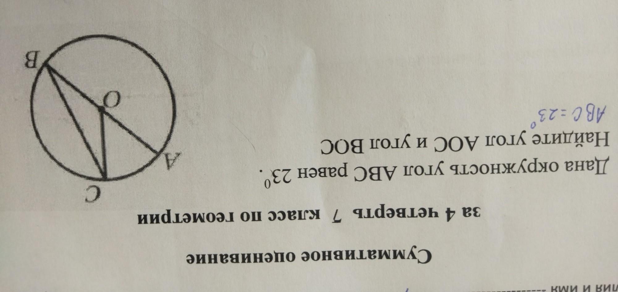 ∠AOC - внешний угол для △BOC, поэтому он может быть вычисленный как сумма двух внутренних углов этого треугольника, не смежных с ним: ∠AOC=∠ABC+∠OCB=23°+23°=46°