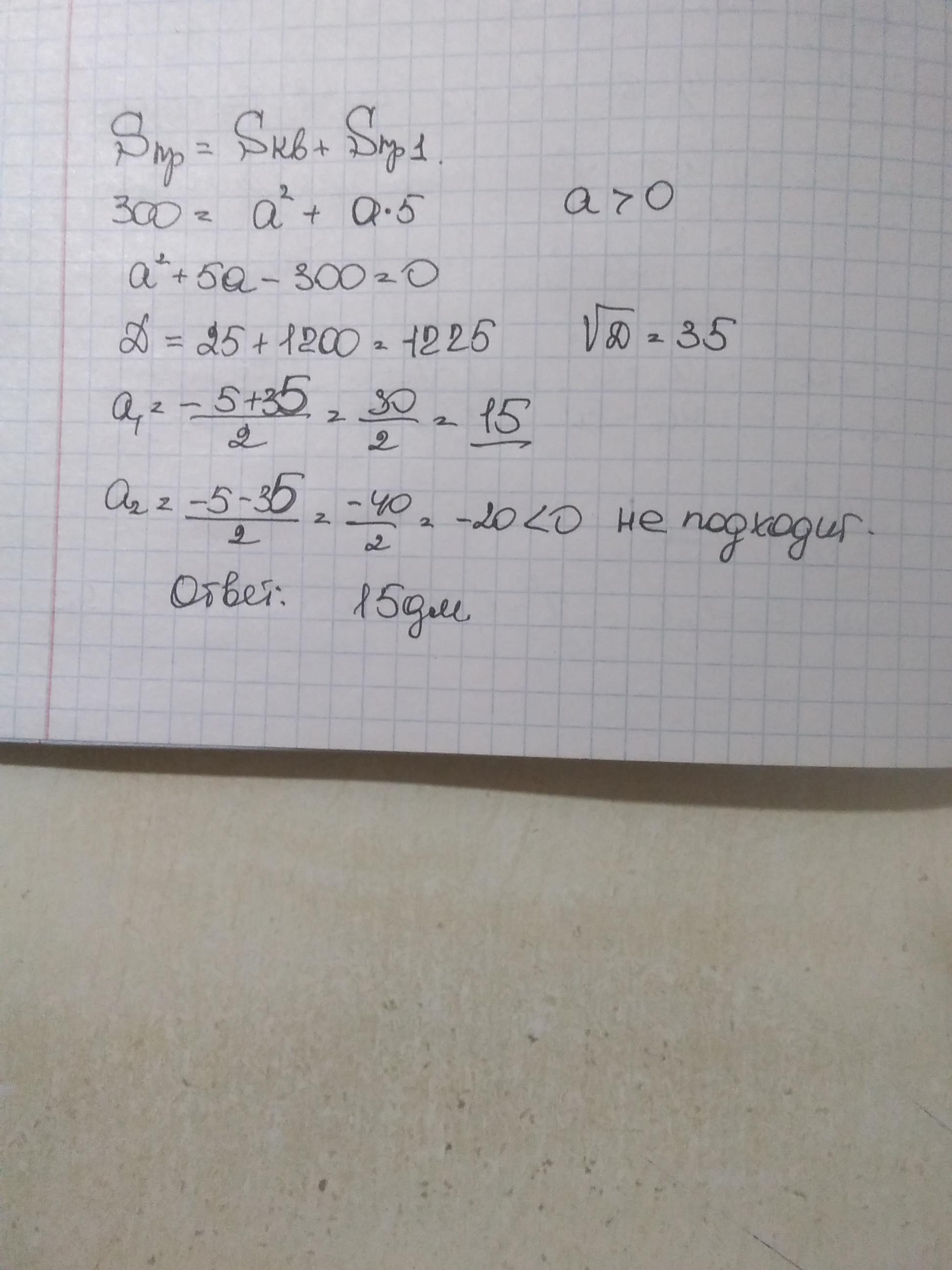Площа прямокутного листа фанери=300 дм² його розрізали на дві частини,одна з яких квадрат ,а друга прямокутник.знайдіть сторону квадрата,якщо сторона одержаного прямокутника ,що не є стороною квадрата =5 дм