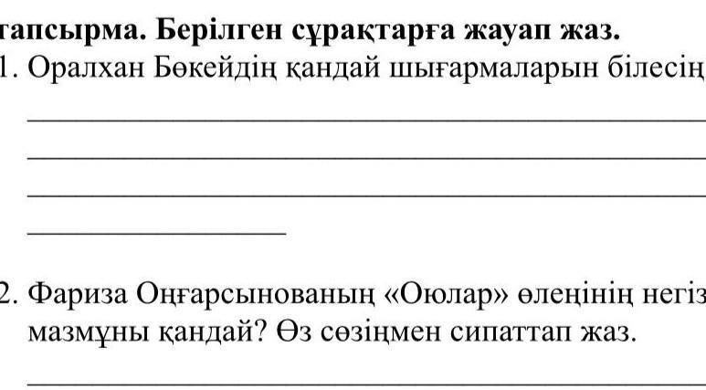 2-тапсырма. Берілген сұрақтарға жауап жаз. 1. Оралхан Бөкейдің қандай білесің?