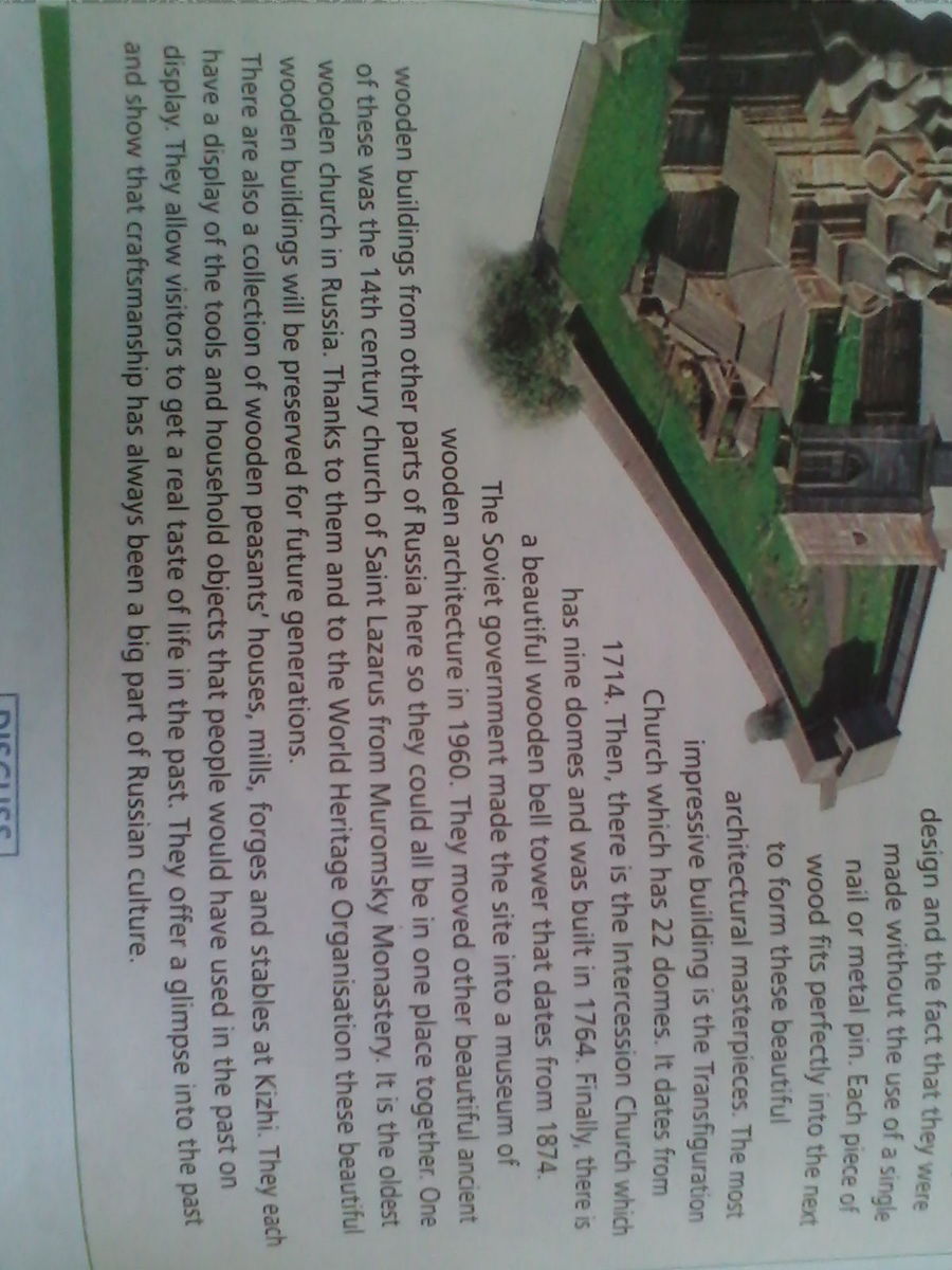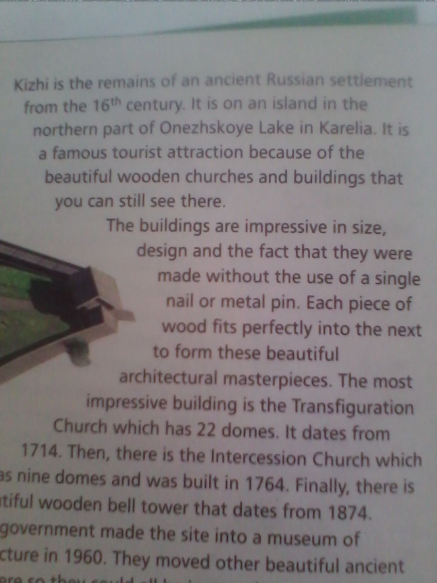 Строения впечатляющего размера и вида, и на самом деле они были сделаны без использования без единого гвоздя или металлической скобы. Каждый кусок дерева идеально подогнан с другим для создания этих архитектурных шедевров. Самое впечатляющее строение это церковь преображения имеющая 22 купола. Она датируется 1714 годом. Затем церковь заступника, с 9 куполами и построенная в 1764 году. Наконец там прекрасная деревянная колокольня которая датируется 1874 годом.