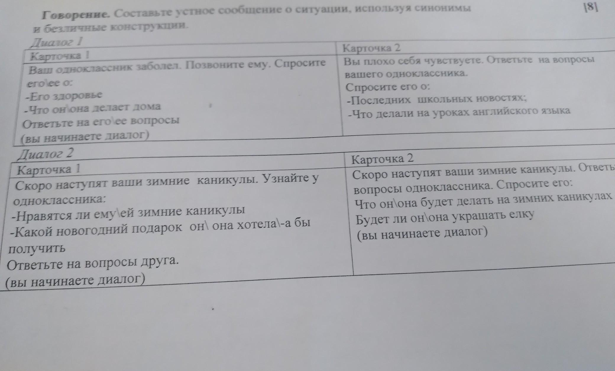 Говорение. Составьте устное сообщение о ситуации, используя синонимы и безличные конструкции. Диалог 1 Карточка 1 Ваш одноклассник заболел. Позвоните ему. Спросите erolee o: - Его здоровье - Что он\она делает дома Ответьте на erolee вопросы (вы начинаете диалог) Диалог 2 Карточка 1 Скоро наступят ваши зимние каникулы. Узнайте у одноклассника: -Нравятся ли ему ей зимние каникулы -Какой новогодний подарок оона хотела -а бы получить Ответьте на вопросы друга. (вы начинаете диалог) Карточка 2 Вы плохо себя чувствуете. Ответьте на вопросы вашего одноклассника. Спросите его о: [8] -Последних школьных новостях; - Что делали на уроках английского языка Карточка 2 Скоро наступят ваши зимние каникулы. Ответьт вопросы одноклассника. Спросите его: Что он она будет делать на зимних каникулах Будет ли он\она украшать елку (вы начинаете диалог)