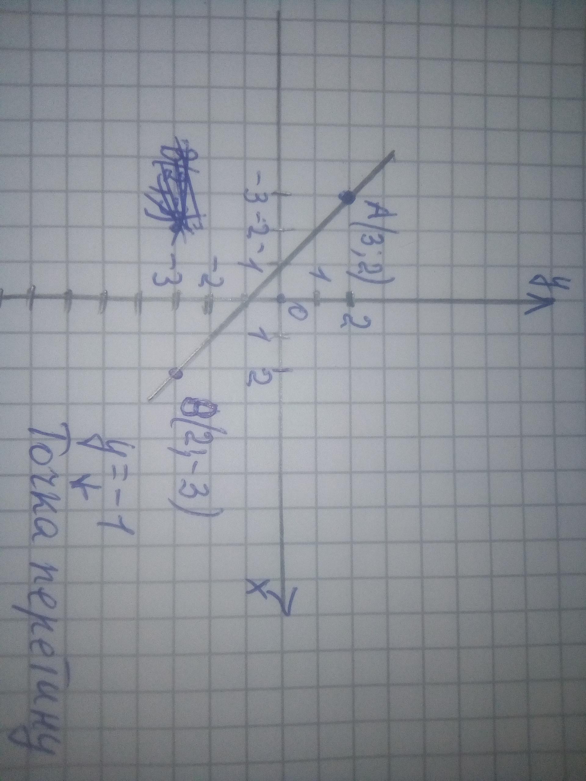 ДОПОМОЖІТЬ БУДЬ ЛАСКА!!!Побудуйте на кординатній площині відрізок АВ де А-(3;2),В(2;-3).Визначте координати точки перетину відрізка АВ та осі ординат.