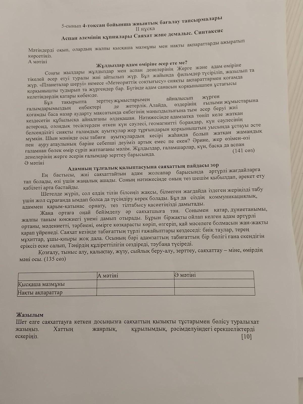 мәтіндерді окып, керсетiнiз. А метiнi Жулдыздар адам өміріне әсер ете ме? Сонгы жылдары жулдыздар мен аспан денелерiнiн Жерге және адам өміріне тікелей әсер етуi туралы жиi айтылып жур. Бул жайында фильмдер тусiрiлiп, жазылып та жур. «Планеталар шеруі» немесе «Метеориттік соктыгысу» сиякты коркынышты тудырып та жүргендер бар. Бүгiнде адам санасын коркынышпен ұстағысы акпараттармен когамда келетiндердiн катары кебеюде. Бұл ғалымдарымыздын журген такырыпта зерттеу жұмыстарымен еңбектері де жетерлік. Алайда, айналысып өздерінің Ғылыми жұмыстарына когамды баса назар аударту максатында еңбегiнiн маныздылығына тым әсер беруi жиi кездесетін кұбылыска айналганы элдекашан. Нәтижесінде адамзатка тенiп келе жаткан астероид, озондык тесіктерден өткен күн сәулесі, геомагнитті борандар, күн сәулесінің белсендiлiгi сиякты ғаламдык ауытқулар жер тұрғындарын қорқыныштын уысында ұстауы әсте мүмкін. Шын мәнінде осы табиғи ауытқулардын кесірі жаһанда болып жатқан жамандык пен ауру атаулынын бәріне себепші деуiмiз артык емес пе екен? Әрине, жер өзімен-өзі ғаламнан бөлек өмір сүріп жатпағаны мәлім. Жұлдыздар, ғаламшарлар, күн, басқа да аспан (141 ce3) денелерiнiң жерге әсерiн ғалымдар зерттеу барысында. Ә мәтіні Адамның тұлғалық қалыптасуына саяхаттын пайдасы зор Ең бастысы, жиi саяхаттайтын адам жолсапар барысында әртүрлі жағдайларға тап болады, өзі үшін жаңалық ашады. Соның нәтижесінде оның тез шешім кыбылдап, әрекет ету кабілеті арта бастайды. Шетелде жүріп, сол елдің тілін білсеңіз жақсы, білмеген жағдайда іздеген жеріңізді табу үшін жол сұрағанда ымдап болса да түсiндiру керек болады. Бұл да сiздiн коммуникациялык, адаммен карым-катынас орнату, тез тiлтабысу касиетіңізді дамытады. Сонымен қатар, дүниетанымы, саяхатшыға тән. Жаңа ортаға онай бейімделу әр жалпы таным көкжиегі үнемі дамып отырады. Бұрын біржақты ойлап келген адам әртүрлі ортаны, мәдениетті, тәрбиені, өмірге көзқарасты көріп, өзгеріп, кай мәселеге болмасын жан-жақты карап үйренеді. Саяхат кезінде табиғаттың түрлі ғажайыптары кездеседi: биік таулар, терең мұхиттар, ұшы-қиыры жоқ дала. Осының бәрі адамзаттың табиғаттың бір бөлігі ғана екендігін еріксіз еске салып, Тәңірдің құдіреттілігін сездіреді, тәубаңа түсіреді. Қозғалу, тыныс алу, калыктау, жүзу, сыйлық беру-алу, зерттеу, саяхаттау - міне, өмірдің мәні осы. (135 сөз) Кыскаша мазмуны А мәтіні Ә мәтіні