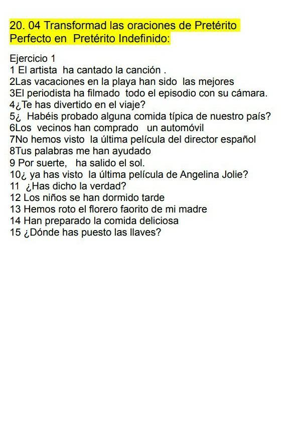 (испанский) Transformad las oraciones de Pretérito Perfecto en Pretérito Indefinido: