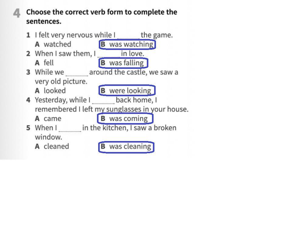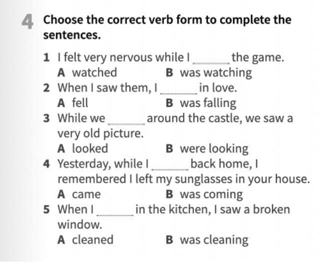 4 Choose the correct verb form to complete the sentences. 1 I felt very nervous while I A watched 2 When I saw them, I A fell 3 While we very old picture. A looked 5 When I the game. window. A cleaned B was watching in love. B were looking back home, I 4 Yesterday, while I remembered I left my sunglasses in your house. B was coming A came in the kitchen, I saw a broken B was cleaning B was falling around the castle, we saw a