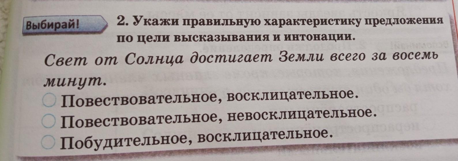 Выбирай! 2. Укажи правильную характеристику предложения по цели высказывания и интонации. Свет от Солнца достигает Земли всего за восемь минут. Повествовательное, восклицательное. Повествовательное, невосклицательное. Побудительное, восклицательное.