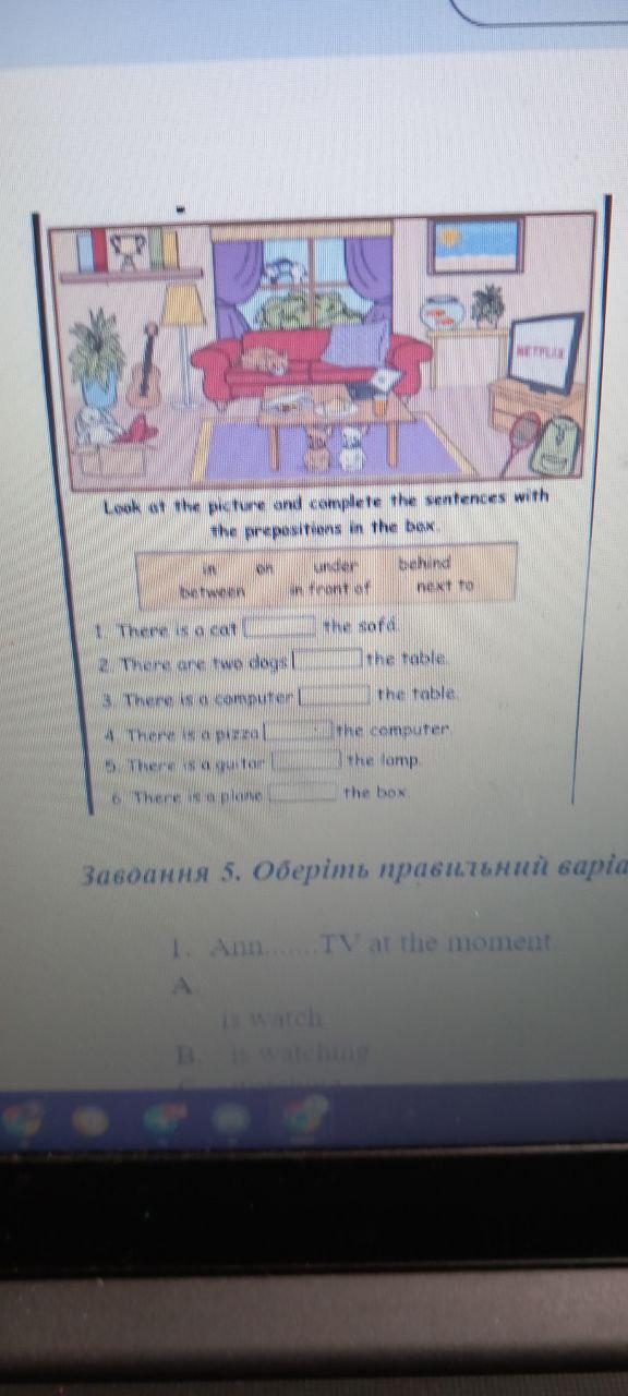 1) On 2) Under 3) On 4) In front of 5) Next to 6) In
