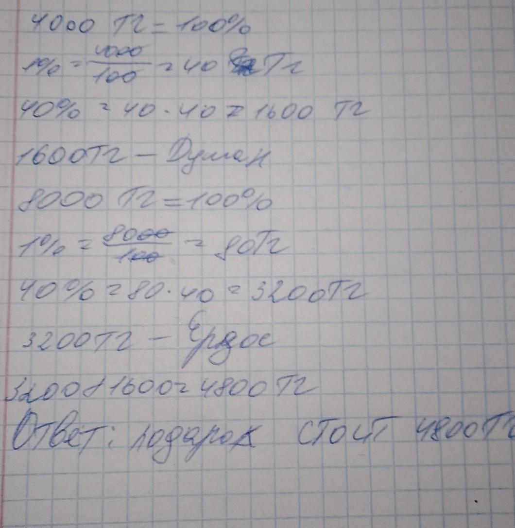 У Думана есть 4000 тг, а у Ердоса - 8000 тг. Думан и Ердос объединили 40% своих денег на подарок матери. Определите цену подарка.