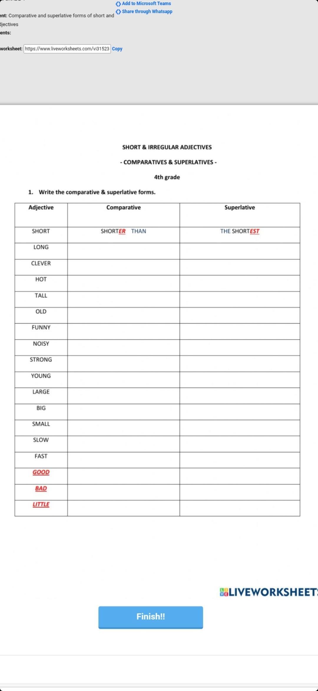 1. longer than, the longest 2. cleverer than, the cleverest 3. hotter than, the hottest 4. taller than, the tallest 5. older than, the oldest 6. funnier than, the funniest 7. noisier than, the noisiest 8. stronger than, the strongest 9. younger than, the youngest 10. larger than, the largest 11. bigger than, the biggest 12. smaller than, the smallest 13. slower than, the slowest 14. faster than, the fasterst 15. better than, the bast 16. worse than, the worst 17. less than, the least.