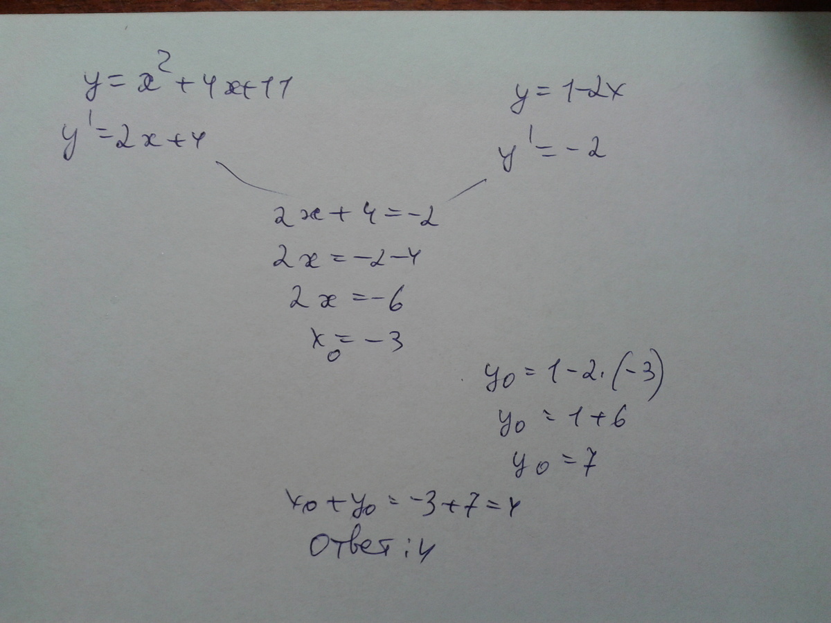 в точке А графика функции y=-x^2+4x+11 проведена касательная к нему ,параллельная прямой y=1-2x. найдите сумму координат точки А