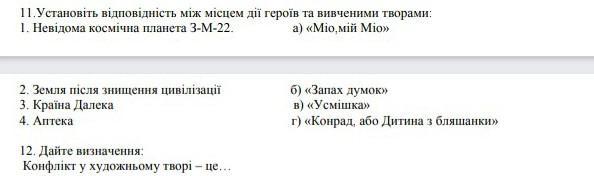 11. Установіть вiдповiднiсть мiж мiсцем дії героїв та вивченими творами: 1. Невiдома космічна планета 3-М-22. a) > 2. Земля пiсля знищення цивілізації 3. Країна Далека 4. Аптека б) «Запах думок» в) > г) «Конрад, або дитина з бляшанки>>