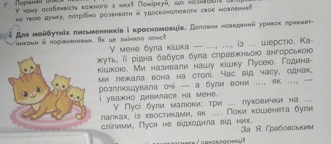 У мене була кішка - мила, гарненька із рижуватою шерстю. Кажуть її рідна бабуся була справжньою ангорською кішкою. Ми назвали нашу кішку Пусею. Годинами лежала вона на столі. Час від часу, однак, розплющувала очі - а вони були чорненькі яі вуголь, і уважно дивилася на мене.