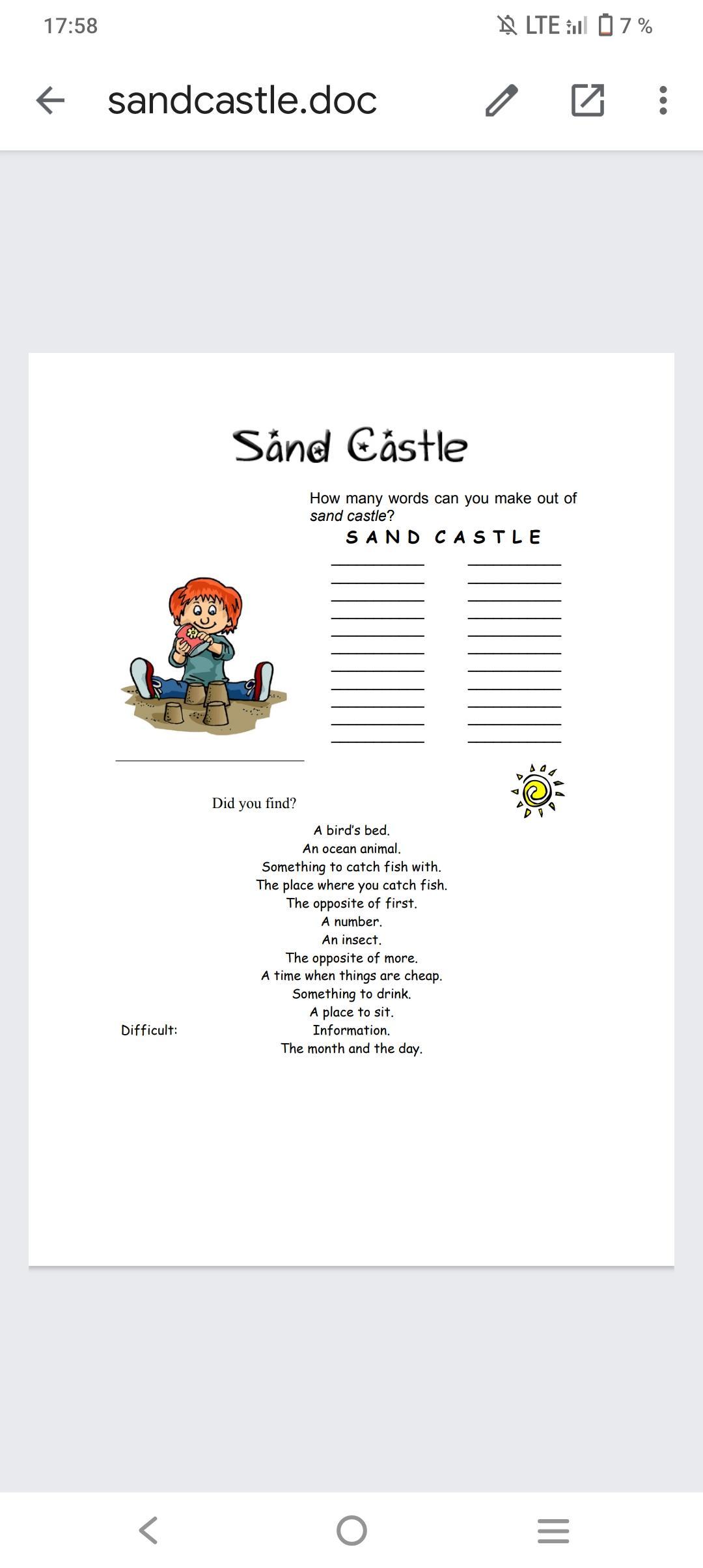 Помогите, нужно найти слова из букв слова sandcastle, по подсказкам, к примеру, где ловят рыбу? (это одна из подсказок) Ответ: sea
