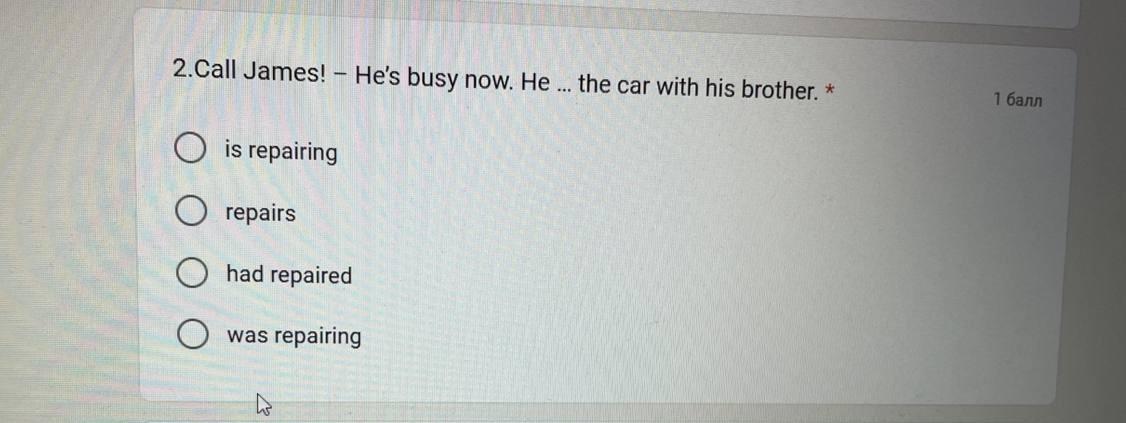 2.Call James! - He's busy now. He ... the car with his brother. * Ois repairing repairs had repaired was repairing 1 балл