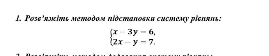Для роз'язання системи рівнянь методом підстановки спочатку вирішимо одне рівняння відносно однієї з невідомих, а потім підставимо це значення в друге рівняння.