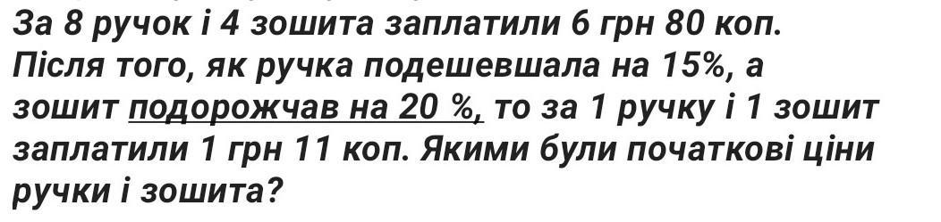Нехай ціна ручки буде х грн, а ціна зошита - у грн. Тоді маємо таку систему рівнянь: