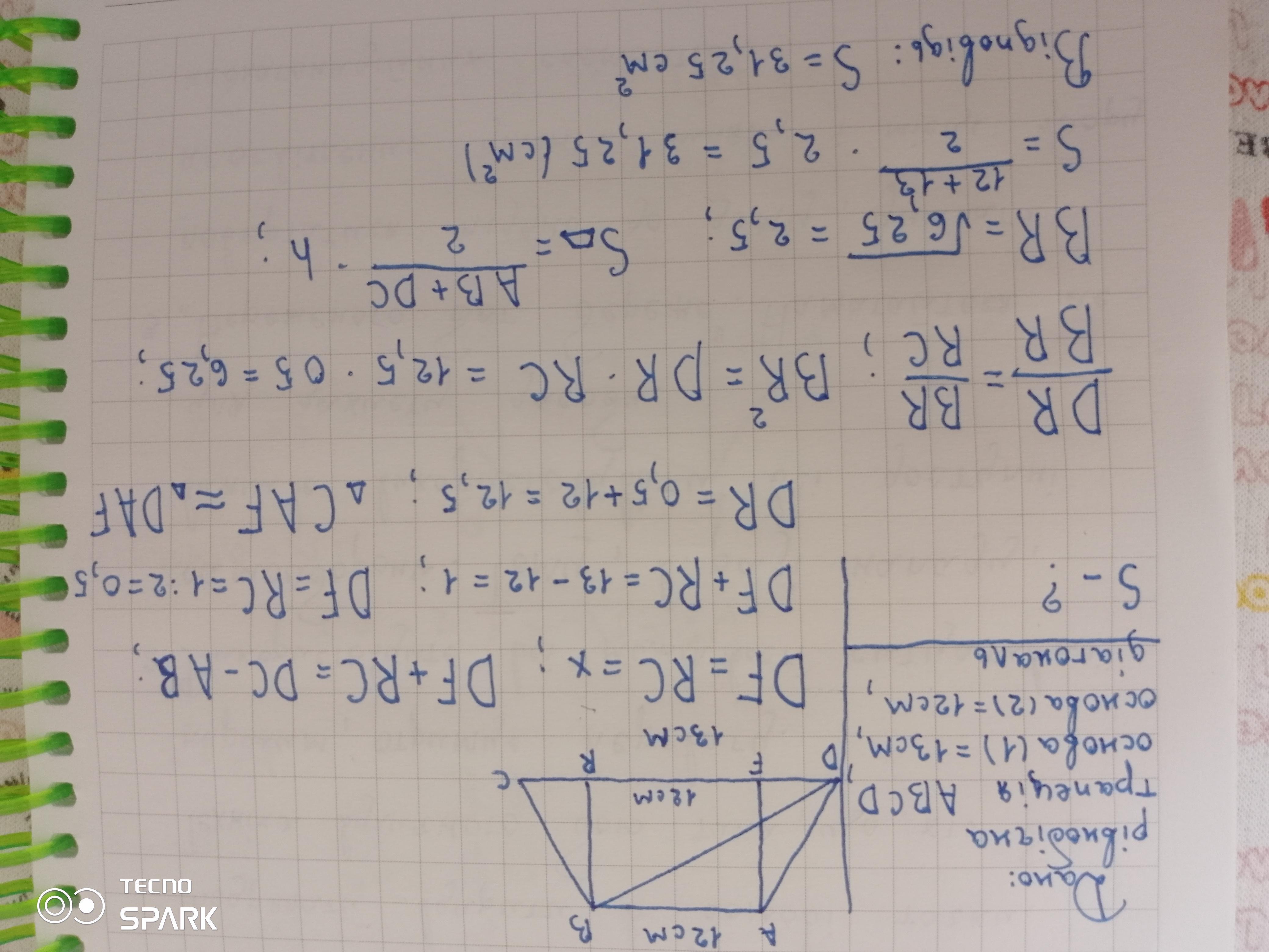 Я не знаю чи правильно, відповідь у мене не дуже красива вийшла. S=62,5√5,75. Якщо вважаєш що ця відповідь можлива, тоді я пришлю рішення.