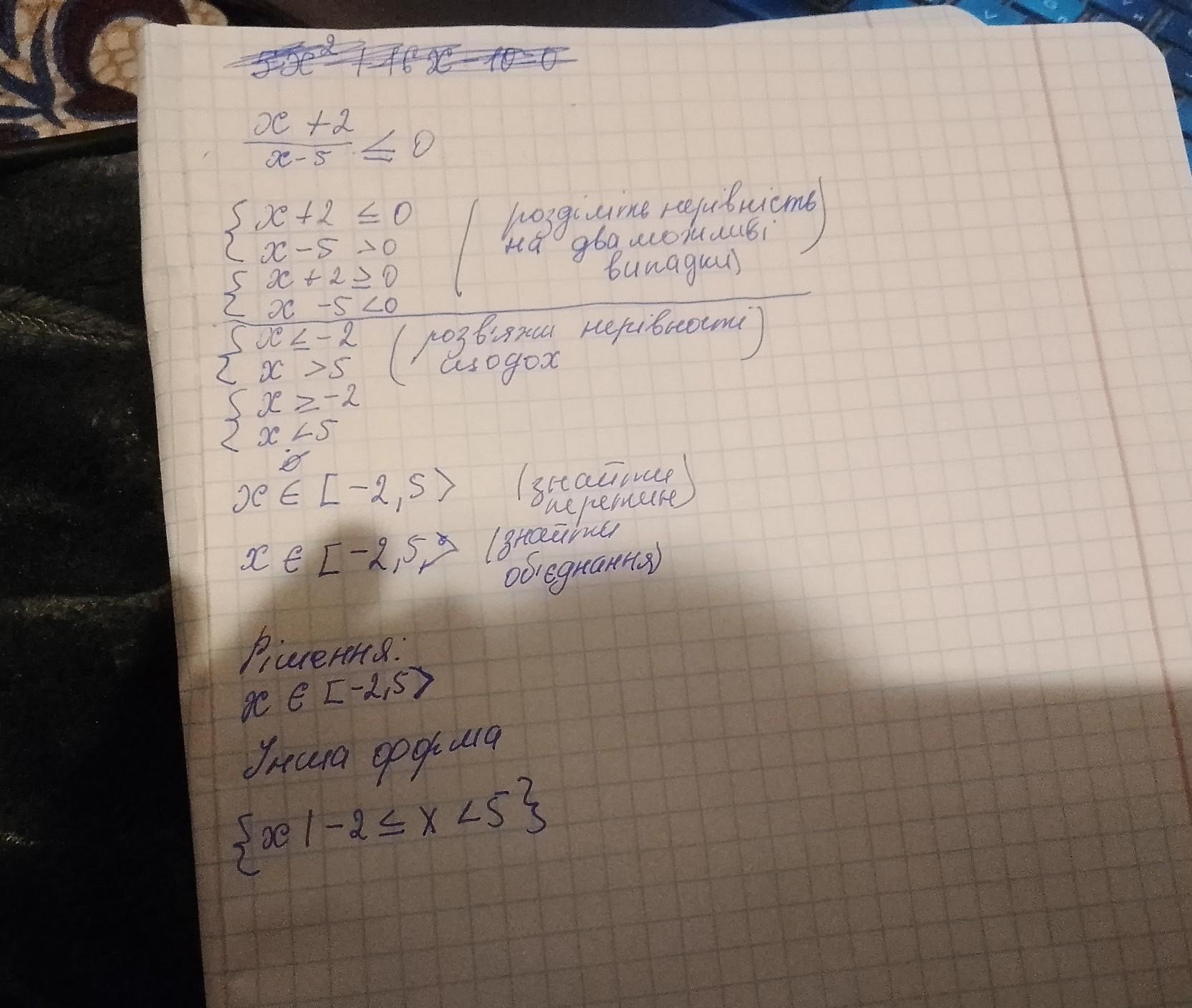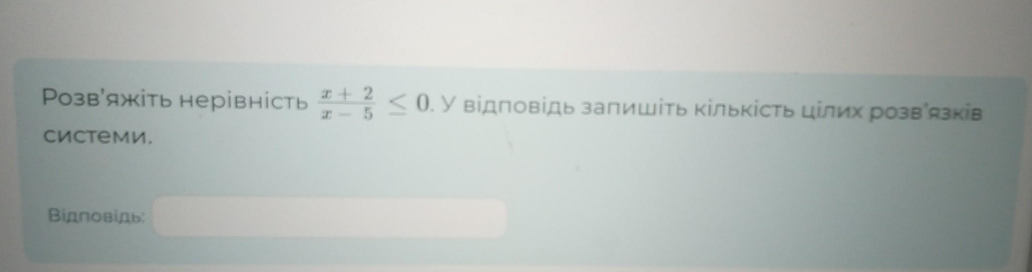 Розв'яжіть нерівність х+2/х-5<0. У відповідь запишіть кількість цілих розв'язків систем.