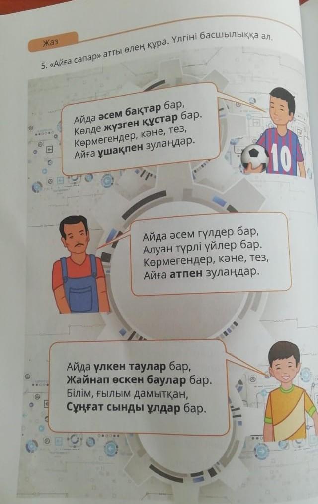 86 О G Жаз 5. «Айға сапар» атты өлең құра. Үлгіні басшылыққа ал. ..00. AT О Айда әсем бақтар бар, Көлде жүзген құстар бар. Көрмегендер, кәне, тез, Айға ұшақпен зулаңдар. Айда үлкен таулар бар, Жайнап өскен баулар бар. Білім, ғылым дамытқан, Сұңғат сынды ұлдар бар. О 0.00.. О Д Ⓒ Айда әсем гүлдер бар, Алуан түрлі үйлер бар. Көрмегендер, кәне, тез, Айға атпен зулаңдар. А orusiy 10. пжжпжпжпжпжпж помогите срочно плииииз