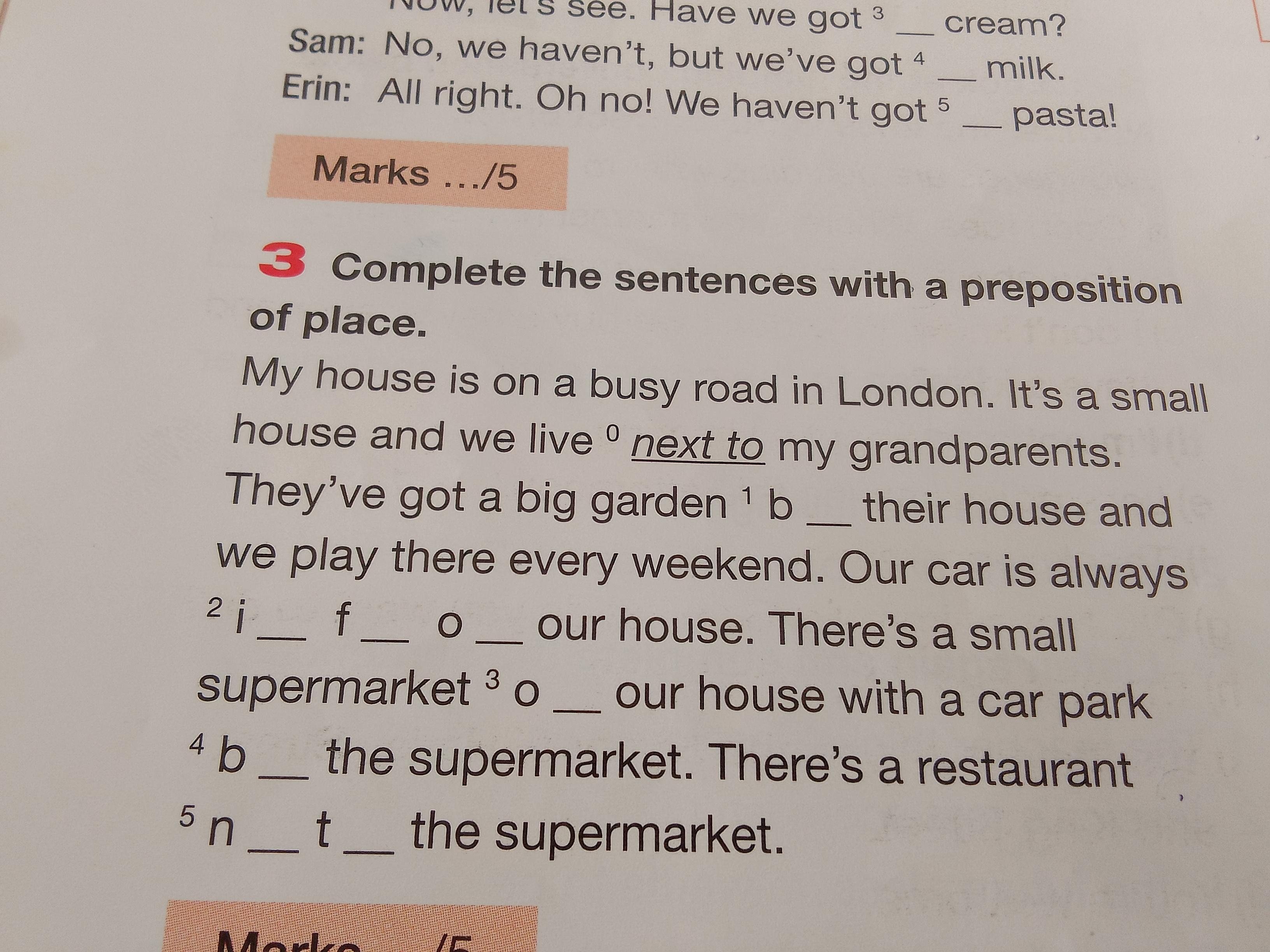 My house is on a busy road in London. It's a small house and we live ⁰next to my grandparents. They've got a big garden ¹b_ their house and we play there every weekend. Our car is always ²i_f_o_ our house. There's a small supermarket ³o_ our house with a car park ⁴b_ the supermarket. There's a restaurant ⁵n_t_ the supermarket.