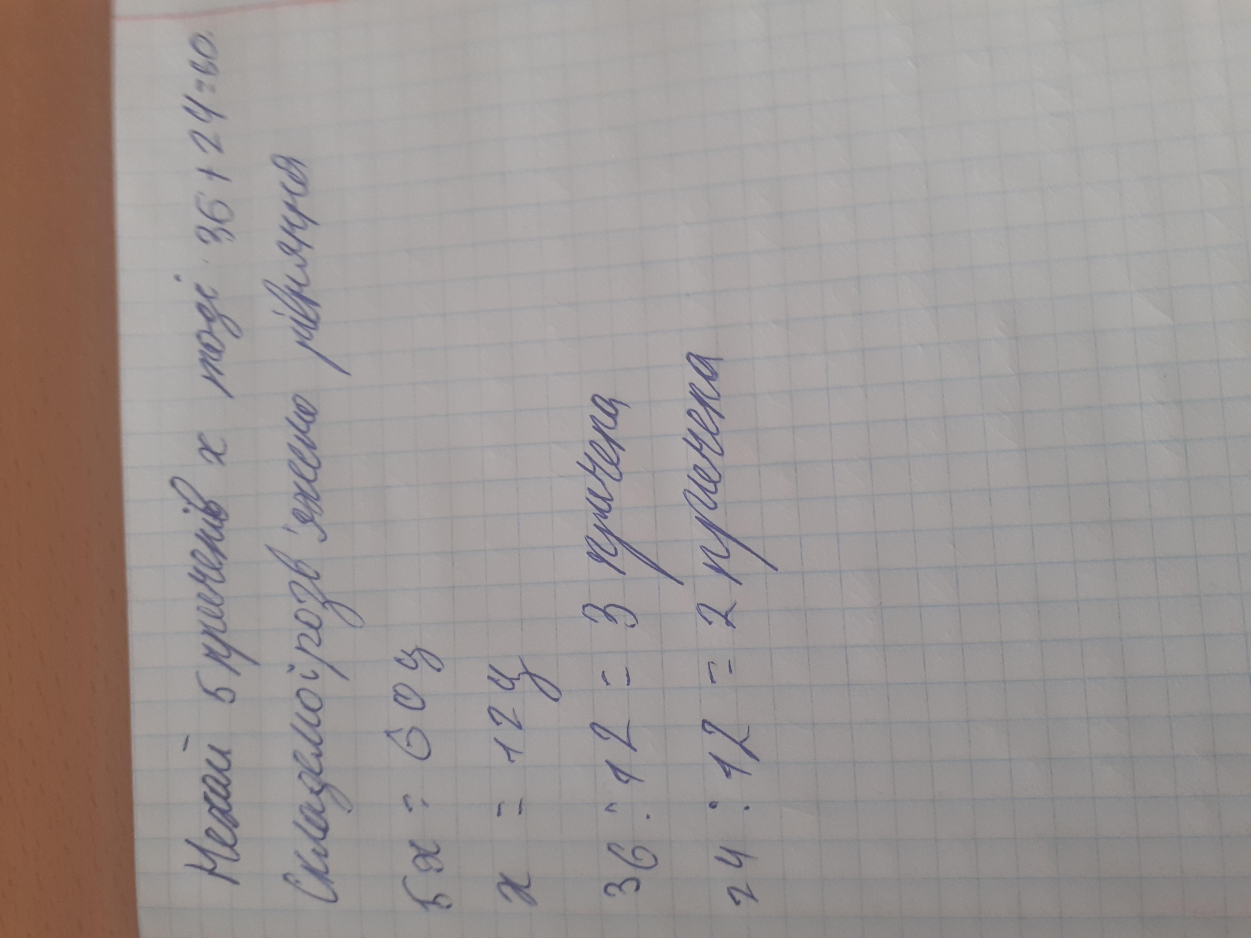 Дві бригади зібрали 5 причепів моркви. Перша бригада зібрала 36 ц, а друга-24 ц. Скільки причепів моркви зібрала кожна бригада?