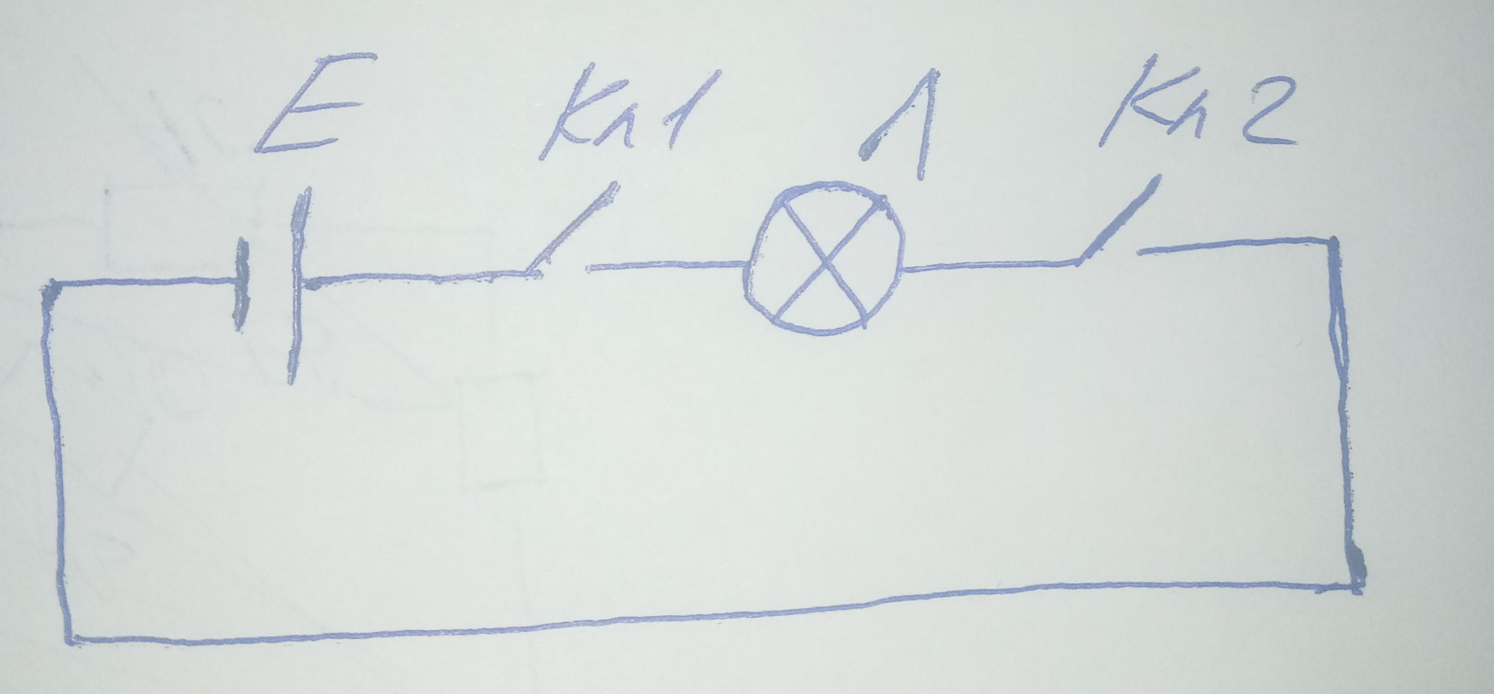 СРОЧНО!!Запропонуйте схему з*єднання джерела струму, лампочки і двох перемикачів, що дозволяє вмикати і вимикати світло з двох різних місць.