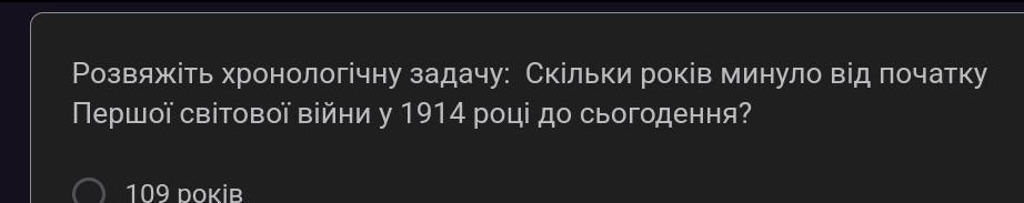 Розвяжіть хронологічну задачу: Скільки років минуло від початку Першої світової війни у 1914 році до сьогодення?