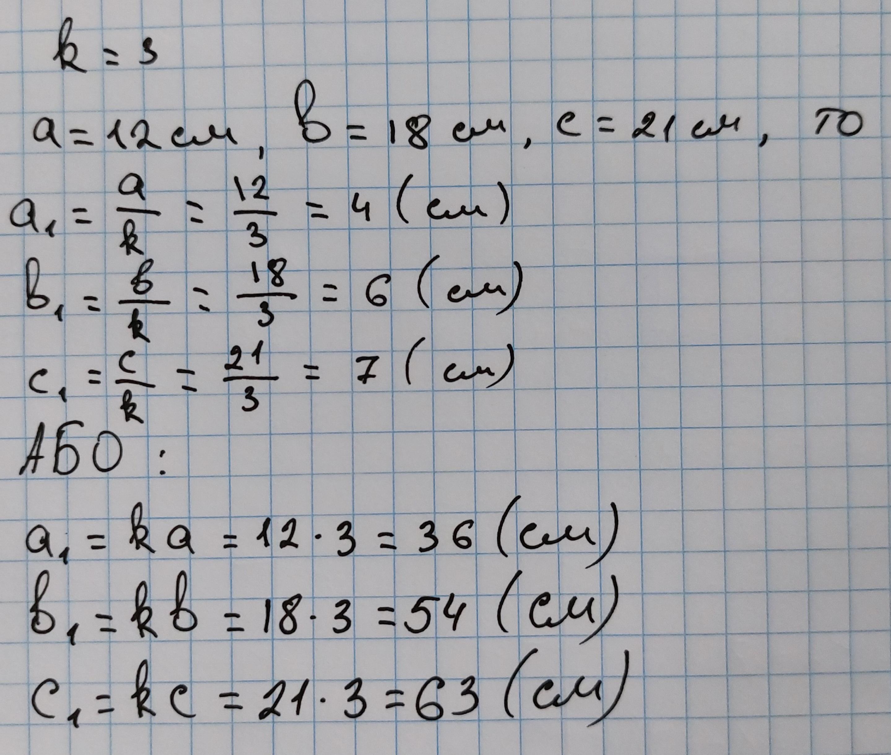 Коефіцієнт подібності двох трикутників дорівнює 3. Сторони одного трикутника дорівнюють 12 см, 18 см та 21 см. Вкажіть сторони другого подібного трикутника