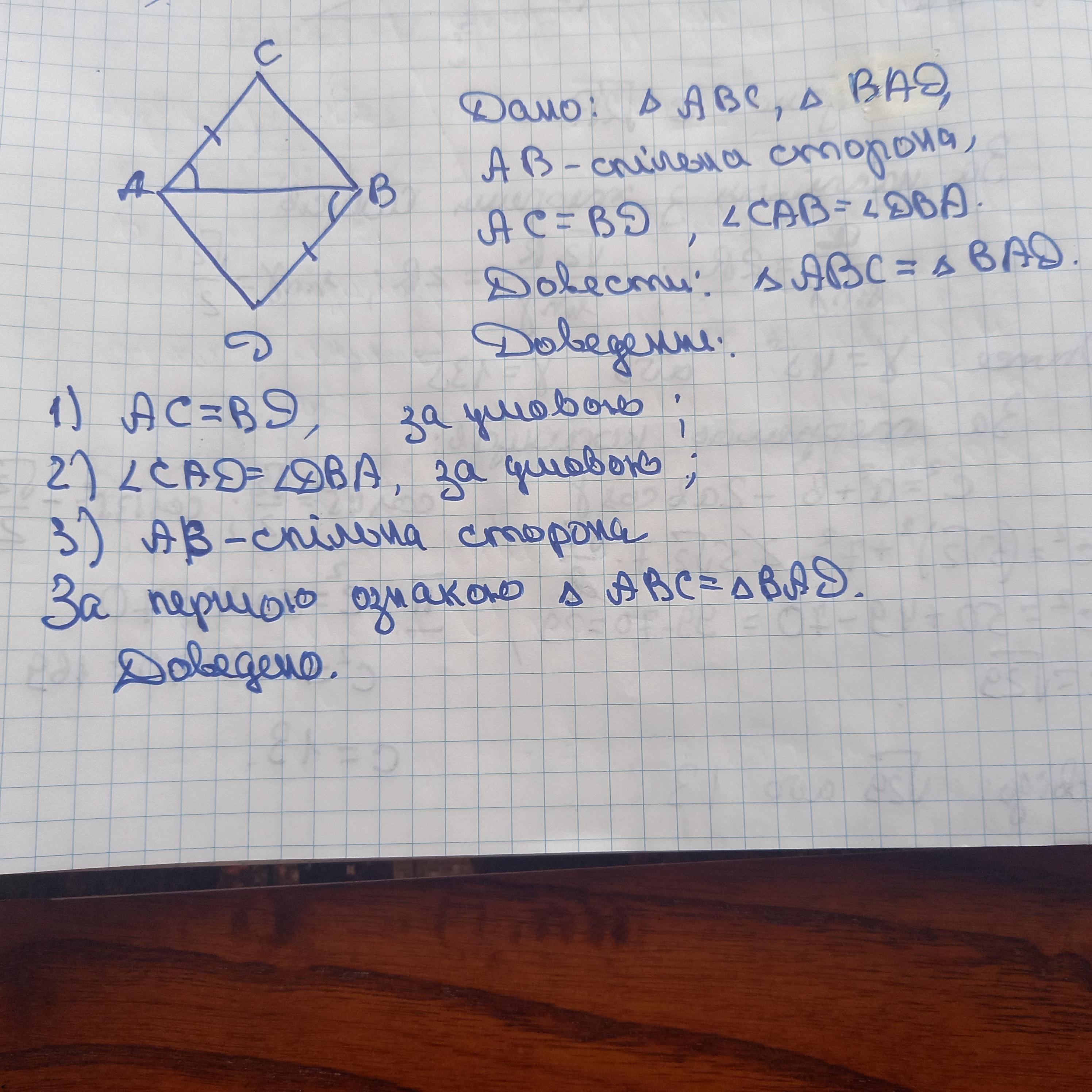 Вершини С і D трикутників АВС і ABD лежать у різних півплощинах відносно прямої АВ, у цих трикутниках AC = BD, кут CAB = кут DBA