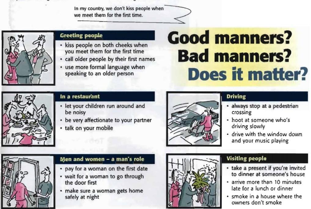 In my country, we don't kiss people when we meet them for the first time. Greeting people • kiss people on both cheeks when you meet them for the first time • call older people by their first names • use more formal language when speaking to an older person In a restaurant . let your children run around and be noisy • be very affectionate to your partner • talk on your mobile Men and women - a man's role • pay for a woman on the first date • wait for a woman to go through the door first • make sure a woman gets home safely at night Good manners? Bad manners? Does it matter? Driving • always stop at a pedestrian crossing - hoot at someone who's driving slowly . drive with the window down and your music playing Visiting people • take a present if you're invited to dinner at someone's house • arrive more than 10 minutes late for a lunch or dinner • smoke in a house where the owners don't smoke
