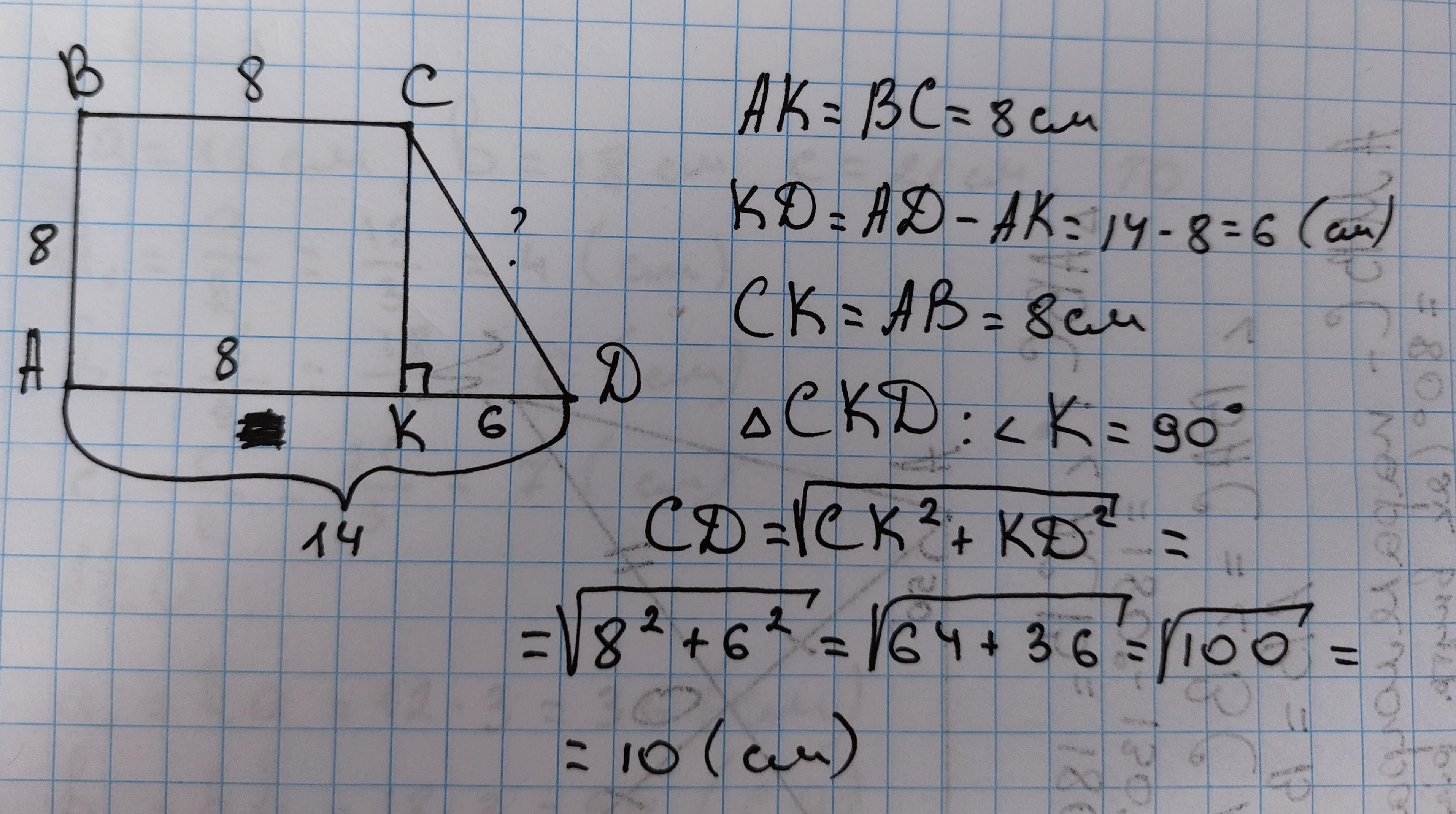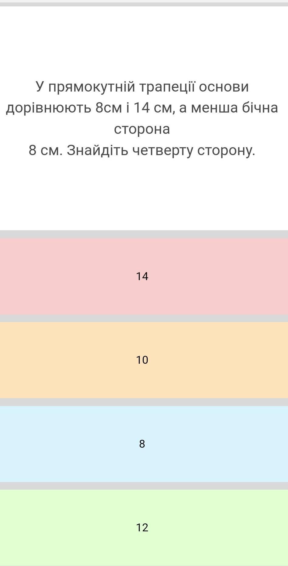 У прямокутній трапеції основи дорівнюють 8см і 14 см, а менша бічна сторона 8 см. Знайдіть четверту сторону.