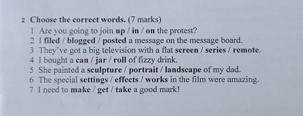 СРОЧНО!!!!! 2 Choose the correct words. (7 marks) 1 Are you going to join up / in / on the protest? 2 I filed / blogged / posted a message on the message board. 3 They've got a big television with a flat screen / series / remote. 4 I bought a can / jar / roll of fizzy drink. 5 She painted a sculpture / portrait / landscape of my dad. 6 The special settings / effects / works in the film were amazing. 7 I need to make / get / take a good mark!