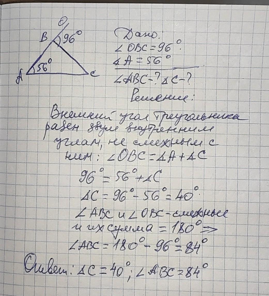 2. Зовнішній кут трикутника 96°, а один із внутрішніх 56°. Знайти кути трикутника.