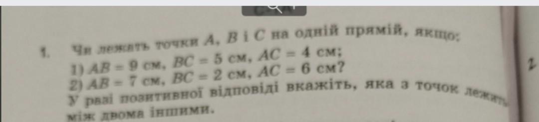 1. Чи лежать точки А, В і С на одній прямій, якщо: 1) AB = 9 см, ВС = 5 см, AC = 4 см; У разі позитивноï вiдповiдi вкажіть, яка з точок лежить 2) AB = 7 см, ВС = 2 см, AC = 6 см? між двома іншими. мiла якого дорівню
