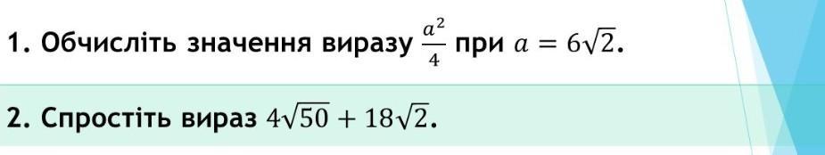 1) Обчисліть значення виразу а²/4 при а = 6√2.