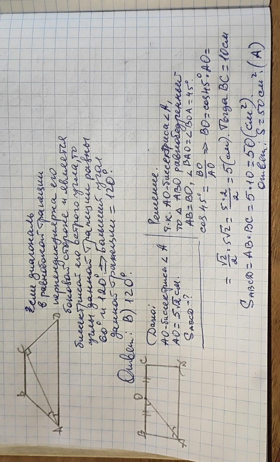 1) Діагональ рівнобічної трапеції є бісектрисою гострого кута і перпендикулярна до бічної сторони. Знайдіть більший кут трапеції